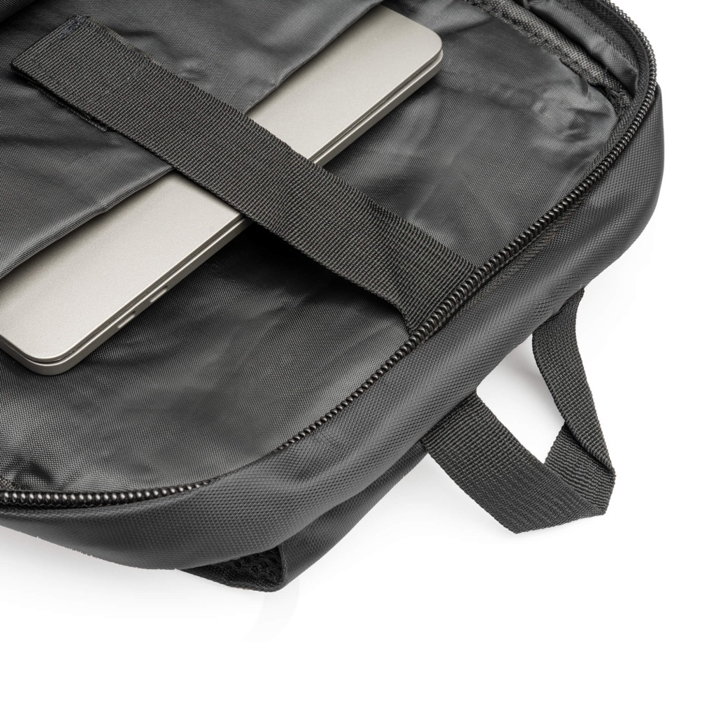 Backpack made of nylon. It has padded shoulder straps, back, and laptop compartment.