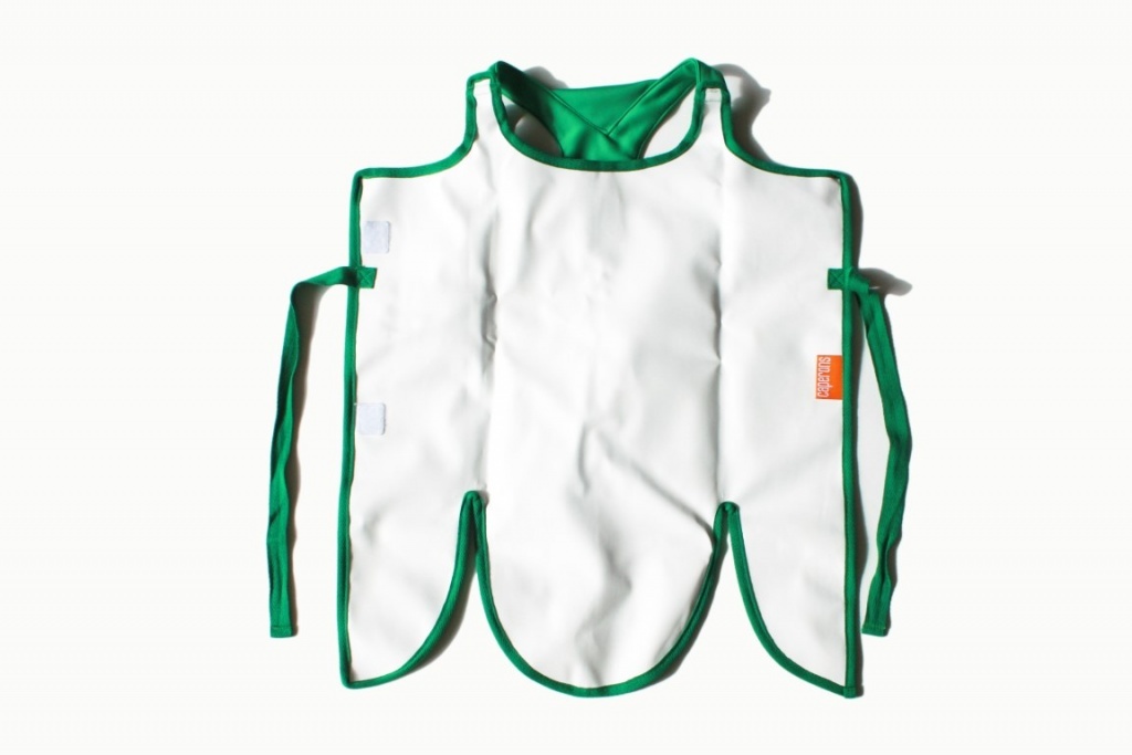This is the only apron designed to be worn as a cape. Caperons convert from apron to cape with ease. The PU-coated apron wipes clean quickly. The scuba knit capes are vivid in color, soft to the touch and resilient. Both the apron and the cape sit comfortably on the shoulders without resting on the neck or throat — a key design feature — and include two elastic straps under the shoulders for a snug fit. Velcro fastenings let children secure the apron before slipping it over their heads to become a cape. Caperons are manufactured from durable, safe materials. The PU-coated cotton apron resists oil and grease and is water-resistant. The cape is made from lightweight polyester scuba knit, feels soft, and holds a three-dimensional shape when worn as a cape.