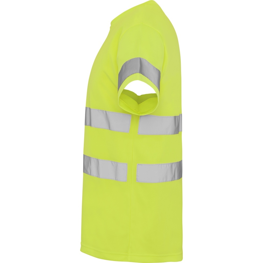 High visibility short sleeve technical t-shirt. Crew neck in the same fabric and reinforced covered seams in collar. Two horizontal reflective bands in body and one in sleeves.
