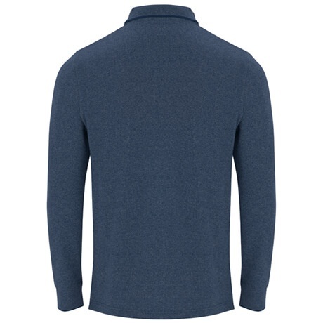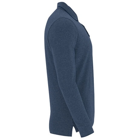 Heather long sleeved polo shirt featuring a 2-button placket in matching tone. Neckline and cuffs are detailed in a solid color. Collar seams are reinforced and covered for durability. Side slits are finished with decorative contrast tape. The back hem is slightly longer than the front for added coverage.