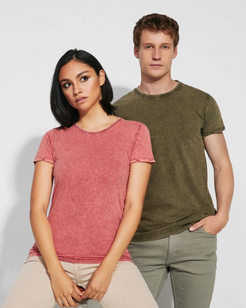 Short-sleeve women's t-shirt with a jeans-effect finish. Featuring a 1x1 rib crew neck and reinforced shoulder-to-shoulder seam coverings. Armholes have a double seam and sleeves are finished with a hem. The HUSKY WOMAN t-shirt's slim round neck adds a feminine touch.