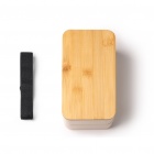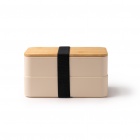 Polypropylene lunch box featuring two compartments and a bamboo lid. Supplied with a cutlery set, a removable compartment and an attachment strap. Capacity: 800 ml.