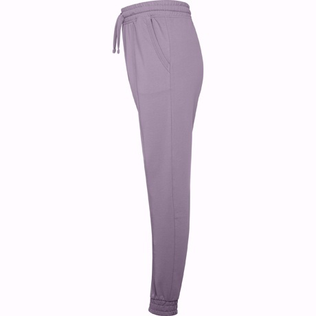 Full-length trousers featuring ribbing at the hem of the main fabric. Elastic waistband with adjustable drawstring. Two side pockets.