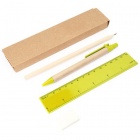 Five-piece stationery set in a kraft cardboard case, featuring a ball pen with a cardboard body and blue ink, a wooden pencil, a sharpener, an eraser and a 15 cm. ruler — ideal for promotional gifts, school kits and on-the-go writing needs.