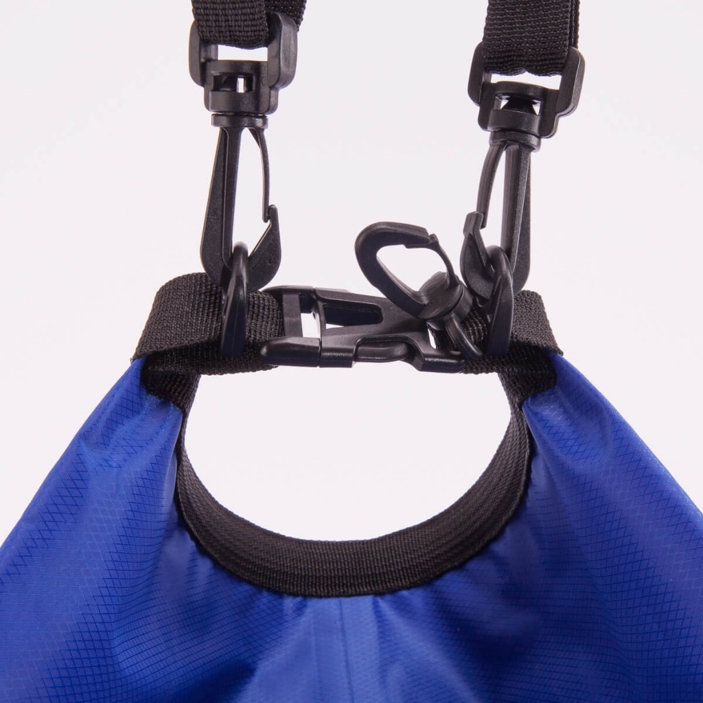 Durable ripstop waterproof bag with a click-seal, watertight closure. Comes with a carabiner and an adjustable shoulder strap for carrying.