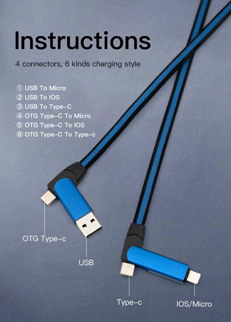 6in1 fast-charging cable with data transfer function, 100 cm.
