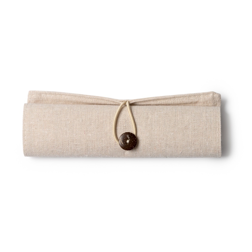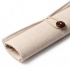 Stationery set includes a bamboo ruler, a paper pencil, a cardboard pen (blue ink), a wooden sharpener and an eraser. All items are presented in a case made of jute and cotton.