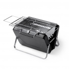 Portable charcoal grill crafted from stainless steel, folding into a briefcase format for easy transport. Packaged in a box designed with the environment in mind and featuring a convenient carrying handle.