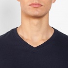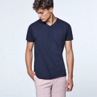 Short sleeve V-neck t-shirt, 4 layer neck. Reinforced covered seams in collar and shoulders, side seams.