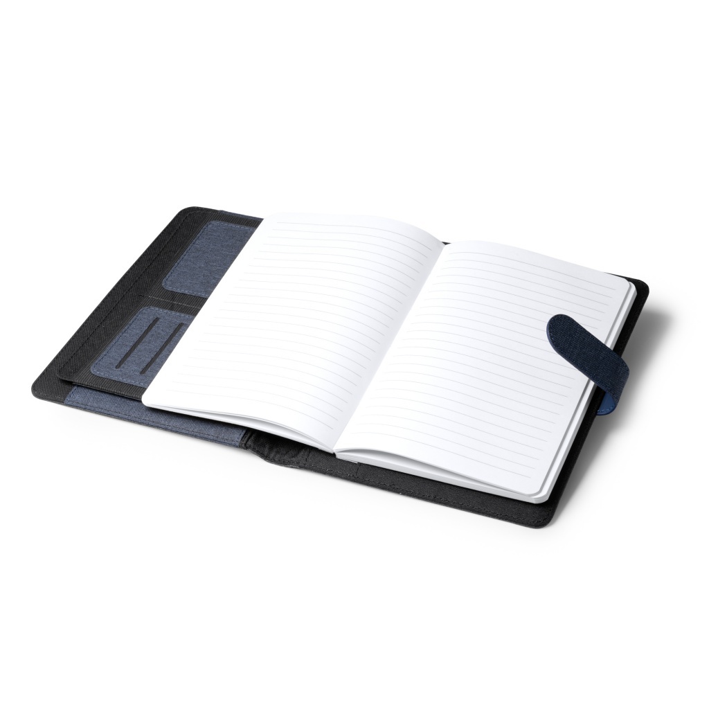 Multifunctional folder crafted from RPET fabric in A5 size, featuring a magnetic closure. Includes a tear-out notebook with 80 lined pages, three main internal compartments, two card pockets and a pen holder. Supplied in an eco design box.