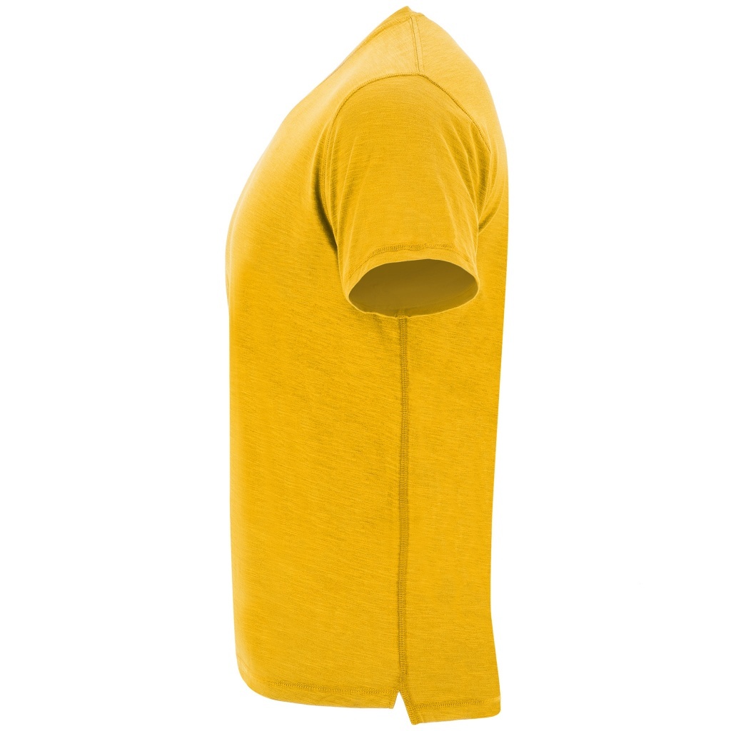 Short-sleeved T-shirt crafted from slanted heather fabric, featuring a crew neck in matching material and a crossed-seam decorative detail. Exposed shoulder-to-shoulder seams provide contrast, while trimmed side seams add subtle ornamentation. The hem includes side slits and the back panel is slightly longer than the front for a modern silhouette.
