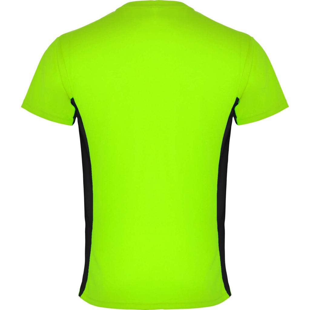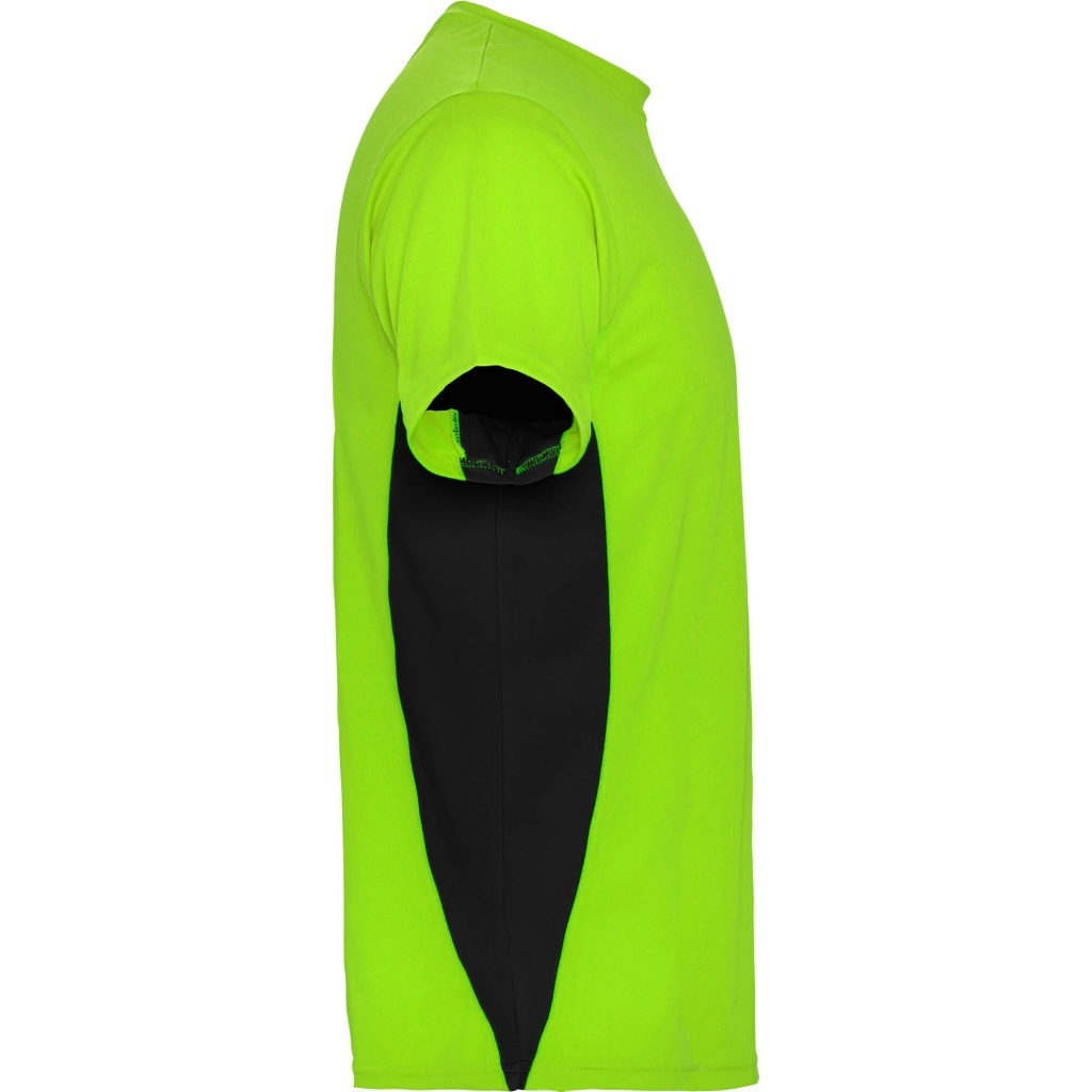 Short-sleeve technical T-shirt with two colour panels. 1.- Crew neck with reinforced seams. 2.- Contrasted side panels.