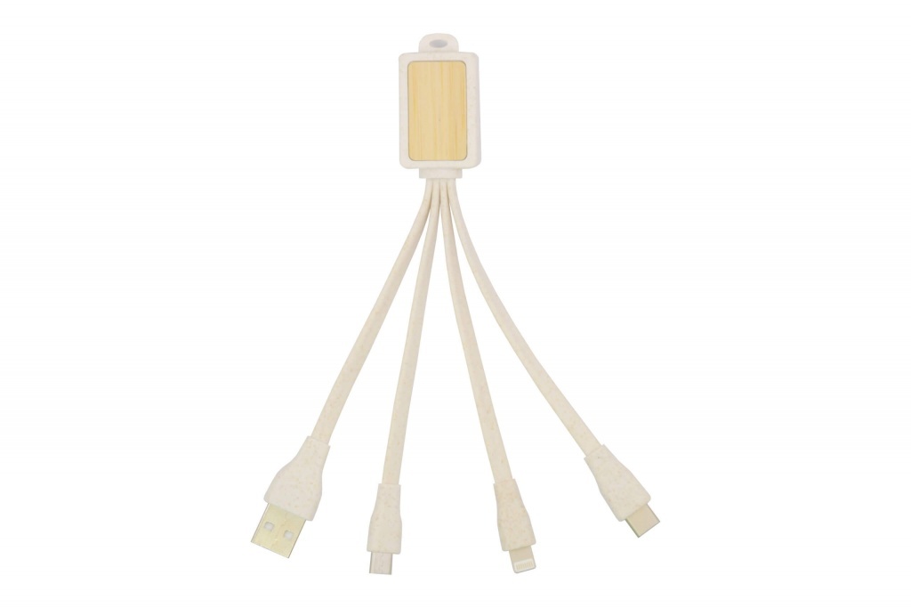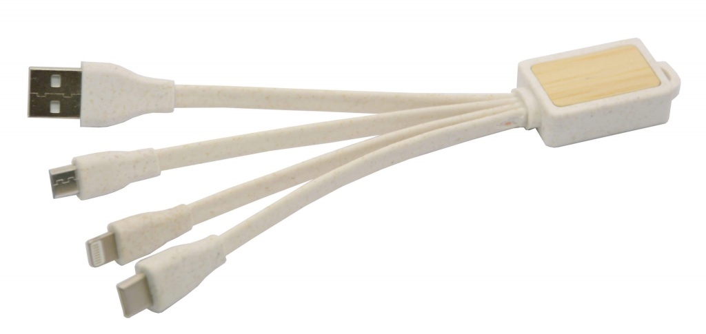 Eco-model to Tree + 1 combines sustainability and practicality: made from 35% wheat straw blended with ABS plus a small piece of bamboo, it features a 15CM cable with USB, Lightning, Micro and Type C ports. The cable supports charging only and does not allow data transfer.