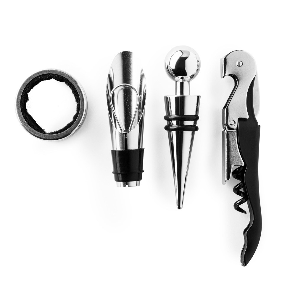 Stainless-steel wine accessory set: double-lever corkscrew with folding blade, drip tray and pouring spout.