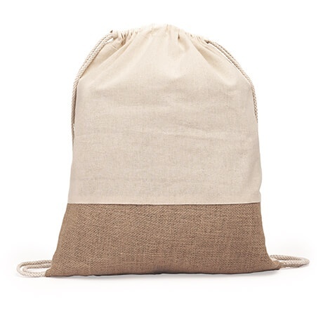 Eco-friendly drawstring backpack crafted from cotton and jute in a natural color.