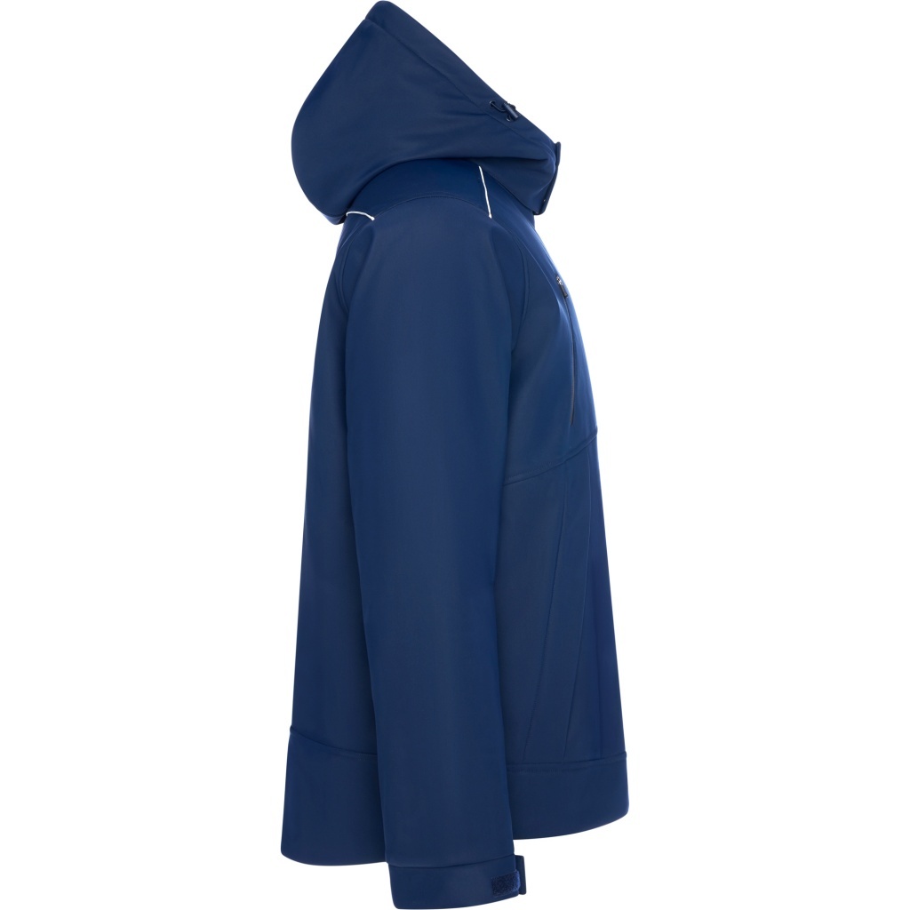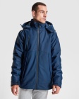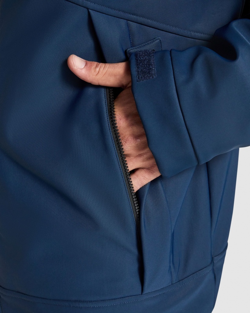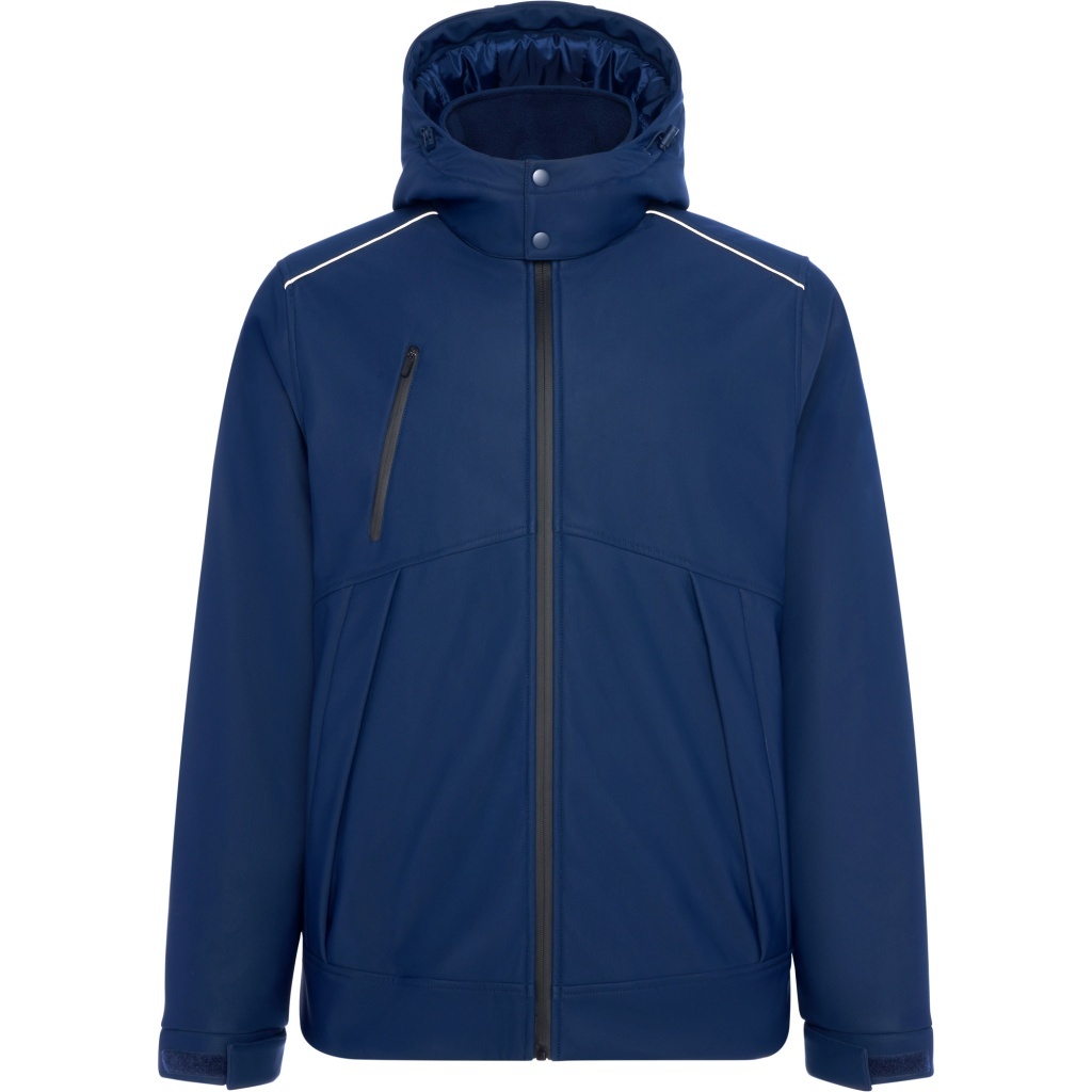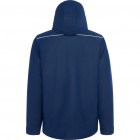 Thermally insulated, padded sports parka designed for certified cold-weather protection. Features reflective accents on the shoulders and back, heat-sealed zippers at the front and on the right chest, and two zippered side pockets concealed by fabric flaps with fasteners. Includes an internal left-side pocket, sleeves with Velcro adjustments and 1x1 ribbed cuffs, a back access panel for recycling, and an integrated hood with drawstrings. (EN 14058:2017).