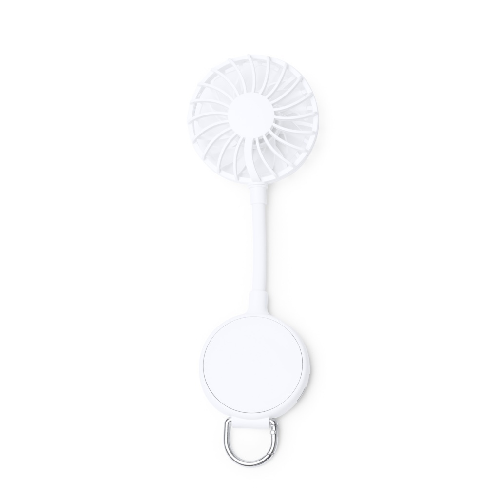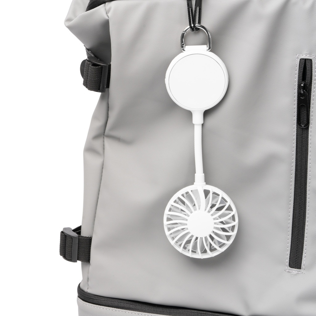 A handheld fan made from recycled ABS plastic, featuring a 500 mAh battery that charges via a cable.