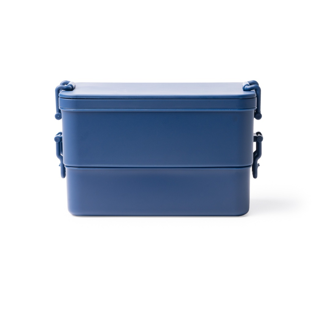 Polypropylene lunch box with a 2.3 L capacity. It features two separate compartments of different sizes that can be stacked or nested. Both compartments close securely with side clips, and the lid contains a set of cutlery held in place by a latch.