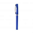 A ballpoint pen constructed from ABS plastic. It includes a cap with a clip, silver-finished accents and a tip, and it contains a blue gel ink cartridge.