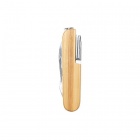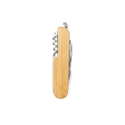 Multi-tool pocket knife with a bamboo body and stainless steel accessories. Features 9 functions and includes a leather carrying strap.