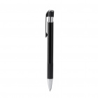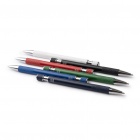 Pen crafted from recycled aluminum with a matte solid-color finish and silver details. Textured grip and button area. Blue ink.