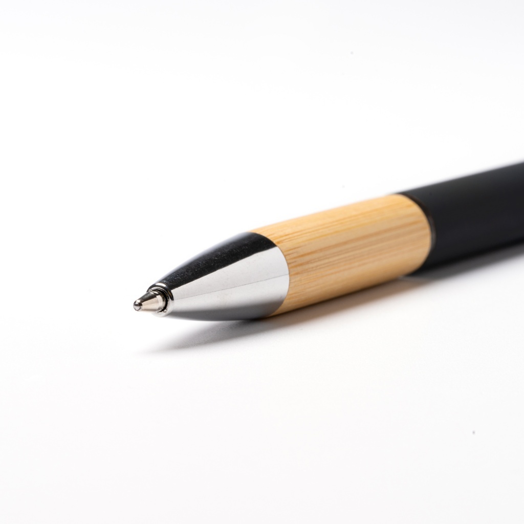 Długopis z aluminiowym korpusem i bambusowym uchwytem łączy wytrzymałość z elegancją. Lekki korpus z aluminium gwarantuje trwałość, a naturalny uchwyt z bambusa dodaje stylu i przyjemnej faktury. Anodowany przycisk pozwala szybko i wygodnie wysunąć końcówkę — wystarczy nacisnąć, by rozpocząć płynne pisanie dzięki wysokiej jakości niebieskiemu tuszowi.