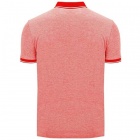 Polo Vigore z krótkim rękawem. Dekolt w jednolitym kolorze z kontrastowym, dekoracyjnym akcentem. Wewnętrzna część plisy wykończona kontrastową ozdobną taśmą i trzema guzikami. Prążkowane mankiety z kontrastowymi detalami. Boczne rozcięcia ozdobione taśmą. Tył jest nieco dłuższy niż przód.