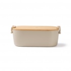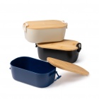 Lunchbox z korpusem z polipropylenu oraz pokrywą wykonaną z bambusa, wyposażony w zabezpieczające zamknięcie.