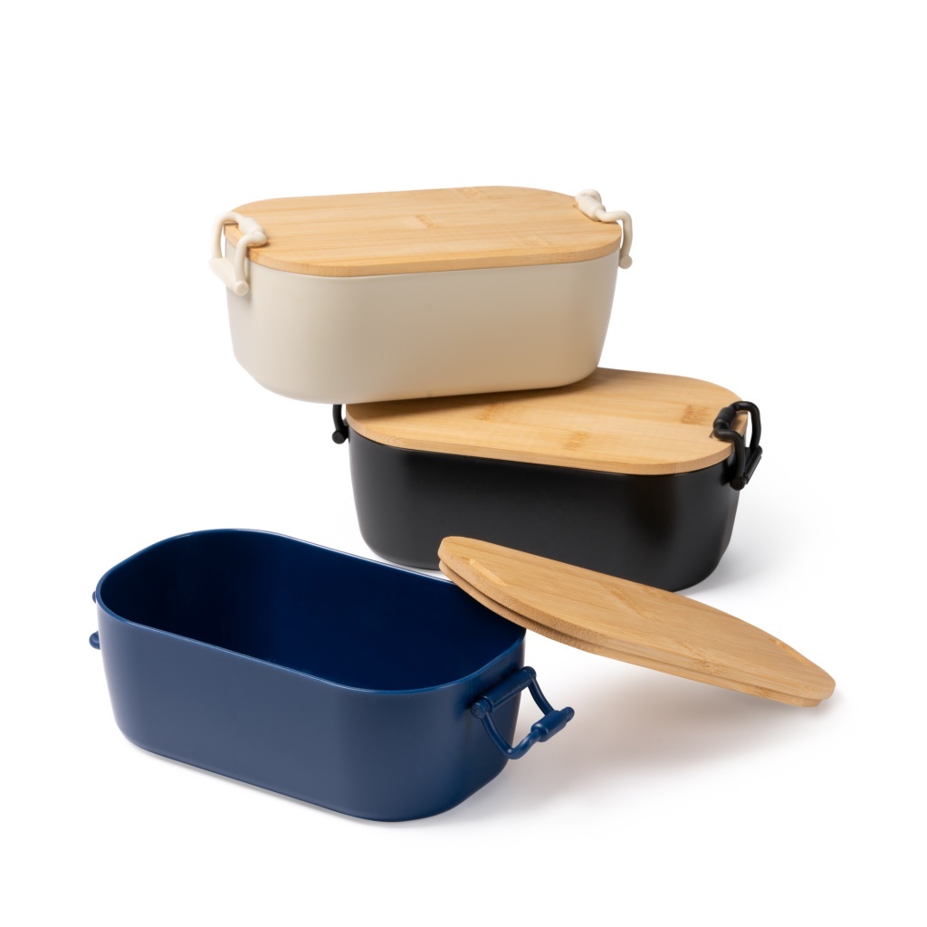 Lunchbox z korpusem z polipropylenu oraz pokrywą wykonaną z bambusa, wyposażony w zabezpieczające zamknięcie.