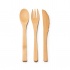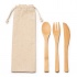 Zestaw sztućców wykonany z naturalnego bambusa, zapakowany w bawełniany woreczek z naturalnego materiału i ściągany sznurkiem. W komplecie znajduje się widelec, nóż oraz łyżka.