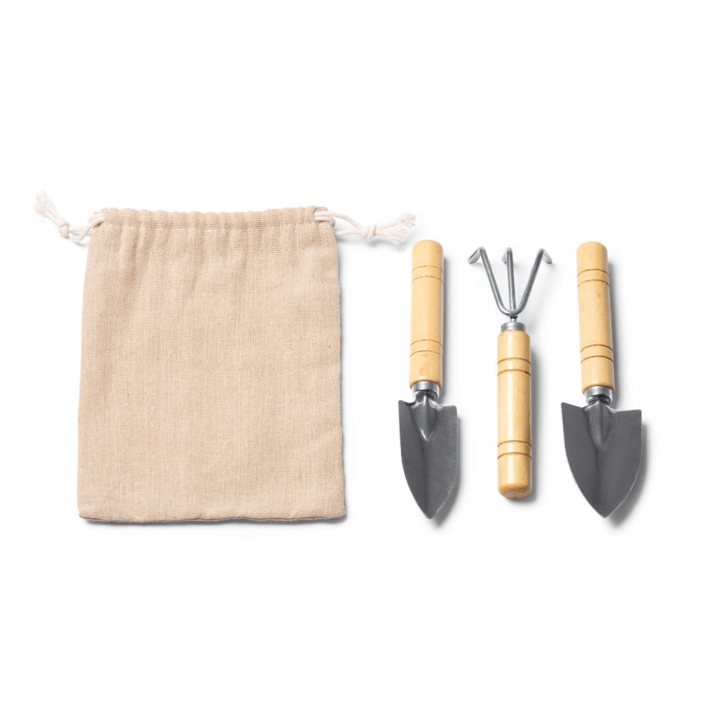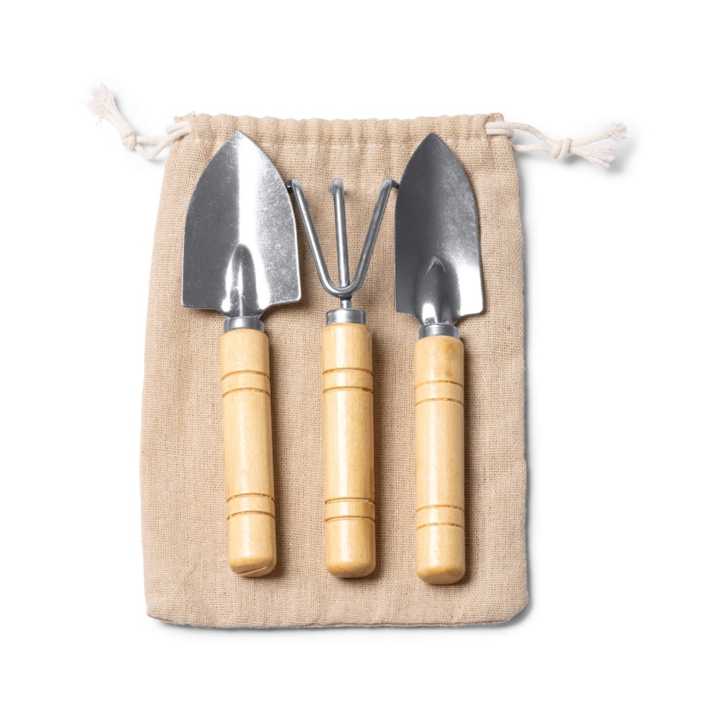 Zestaw trzech narzędzi ogrodniczych ze stali nierdzewnej z uchwytem z bambusa. W komplecie znajdują się dwie łopatki do przesadzania oraz grabie. Dołączone bawełniane etui. Produkt zapakowany w ekologiczne pudełko.