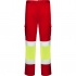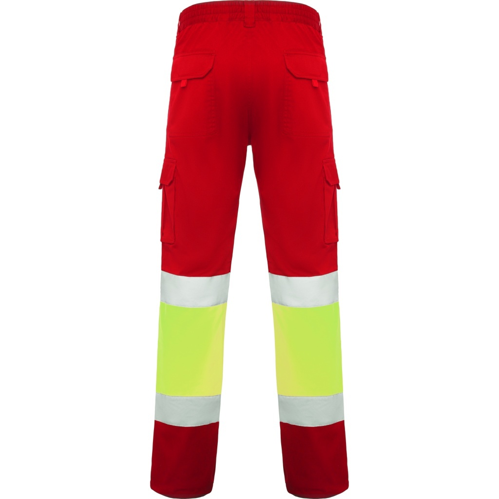 Długie spodnie robocze z licznymi kieszeniami, dobrze widoczne z daleka.