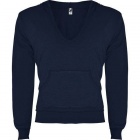 Bluza z kapturem i dekoltem w szpic, wykończonym tą samą tkaniną. Kieszeń typu kangurka. Mankiety i dół bluzy wykończone lamówką 1x1 z niewykończonymi przeszyciami.