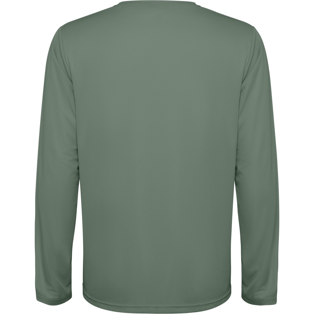 Uniseksowa koszulka techniczna z długimi rękawami. Szycia w kołnierzu pokryte materiałem w tym samym kolorze. Tył koszulki jest nieznacznie dłuższy od przodu. Boczne szwy przesunięte ku przodowi.