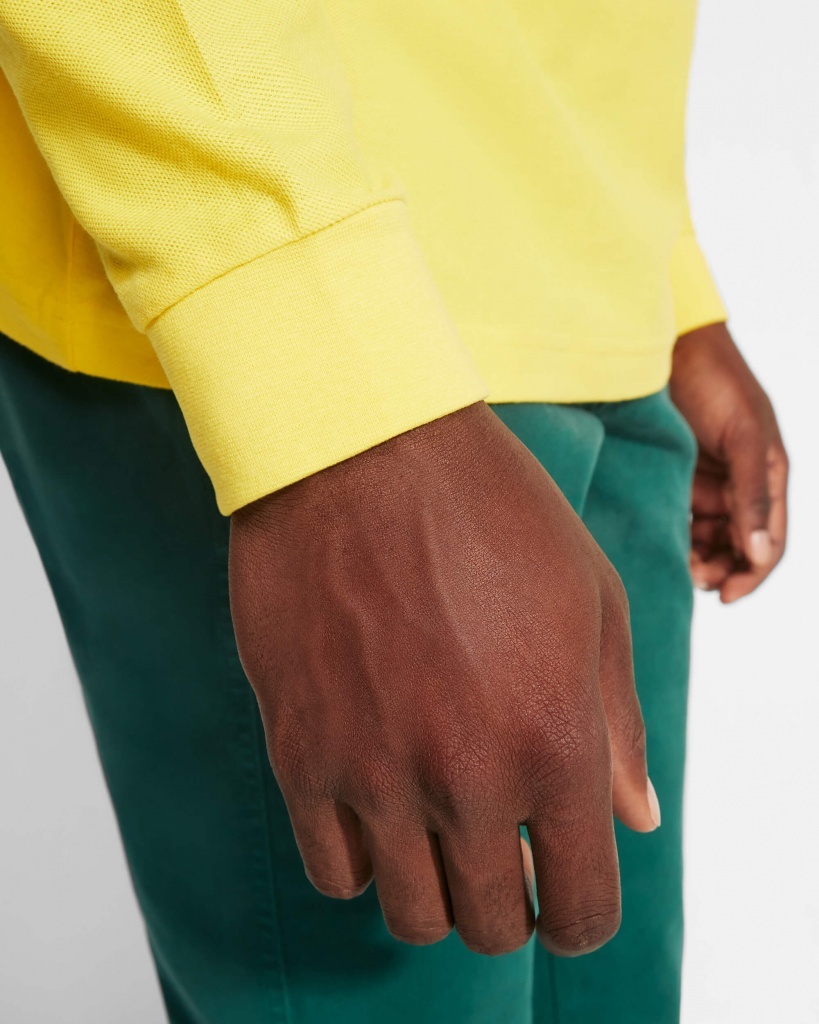 Koszulka polo z długim rękawem. Zapięcie z trzema guzikami. Prążkowany kołnierzyk i mankiety. Wzmocnione, kryte szwy przy kołnierzyku. Elastyczne ściągacze przy mankietach. Rozcięcia boczne u dołu.