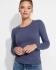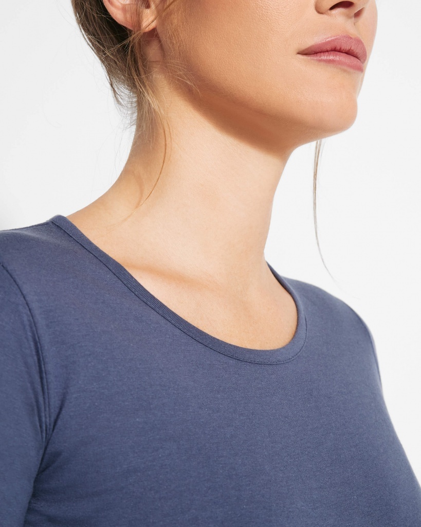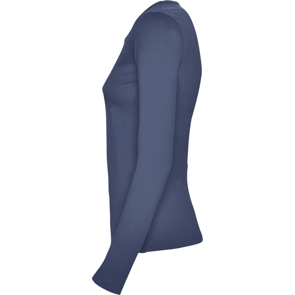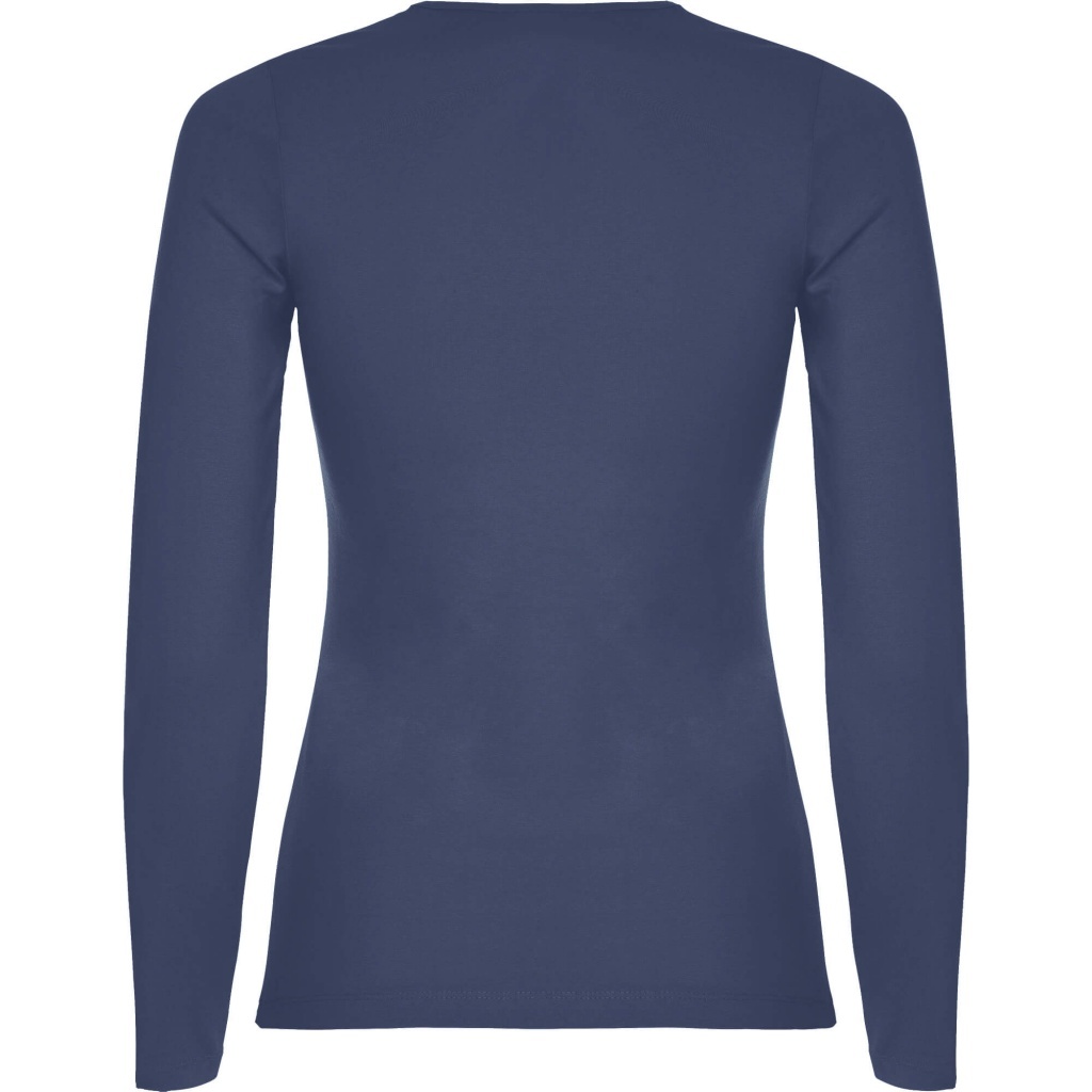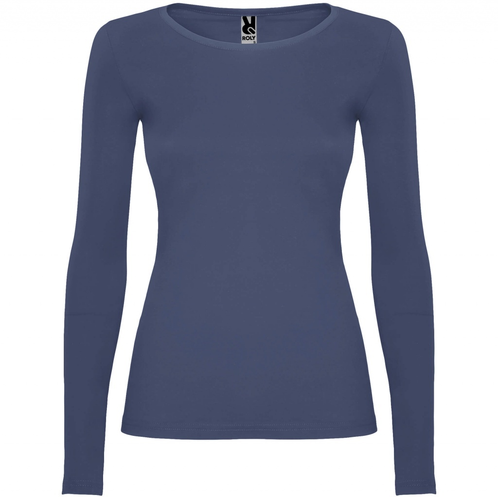 Damska koszulka z długim rękawem o dopasowanym kroju. Bez mankietów. Posiada szwy boczne.