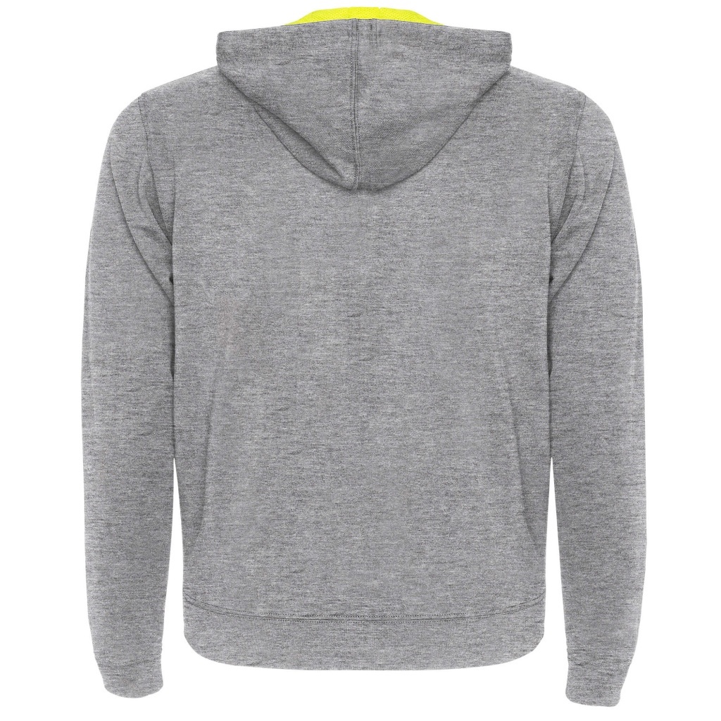 Rozpinana bluza z fluorescencyjnymi akcentami. Kaptur ma podszewkę z mikro perforowanej tkaniny poliestrowej w kontrastującym fluorescencyjnym kolorze. Sznurek i metalowe oczka również w fluorescencyjnym kolorze. Prążkowane mankiety i dół bluzy 1x1.