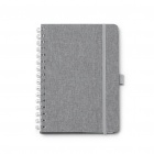 Notatnik A5 z twardą okładką z tkaniny poliestrowej RPET pochodzącej z recyklingu oraz podwójną spiralą. Wyposażony w elastyczne zapięcie na gumkę i dopasowany uchwyt na długopis. Zawiera 80 kartek w linie — idealny do uporządkowanych notatek.