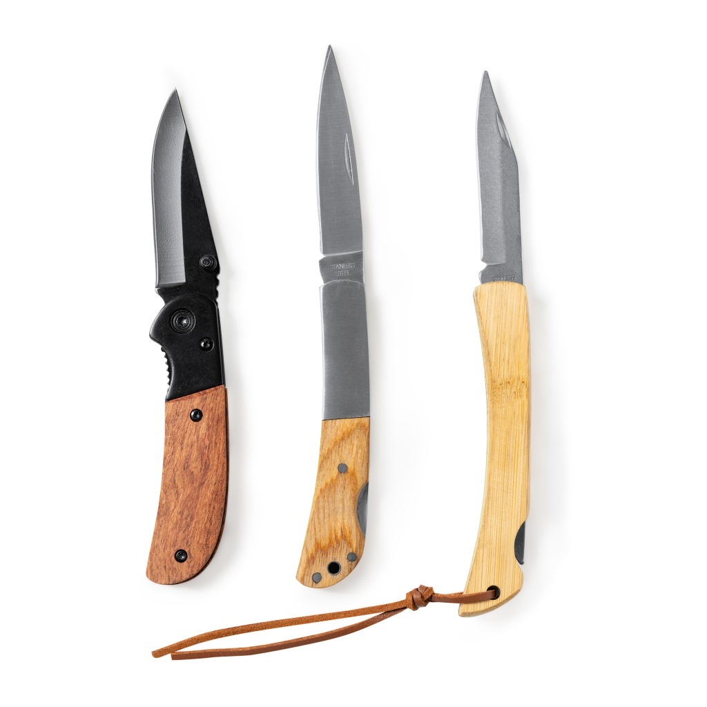 Składany scyzoryk ze stali nierdzewnej z czarnym ostrzem i uchwytem z naturalnego drewna. Wyposażony w blokadę bezpieczeństwa.