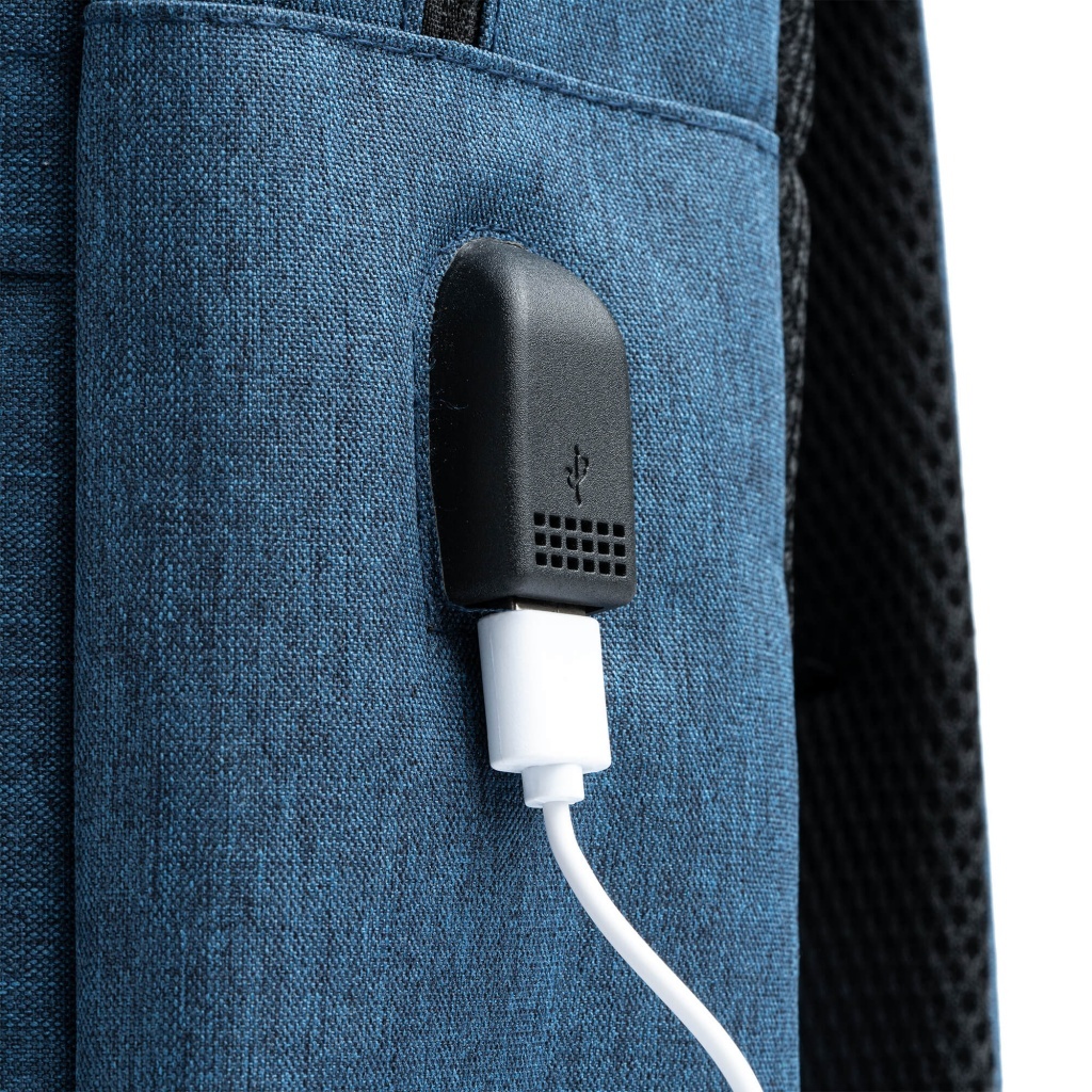 Plecak wykonany z poliestru 600D. Wyposażony we wbudowany port USB umożliwiający podłączenie własnego power banka, posiada przednie i boczne kieszenie, wyściełane plecy oraz szelki. Główna komora jest również wyściełana — idealna na laptopa lub tablet.
