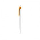 Biały długopis z klipem dostępnym w różnych kolorach. Wkład z niebieskim tuszem zapewnia wyraźne pismo.