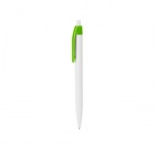 Biały długopis z klipem dostępnym w różnych kolorach. Wkład z niebieskim tuszem zapewnia wyraźne pismo.