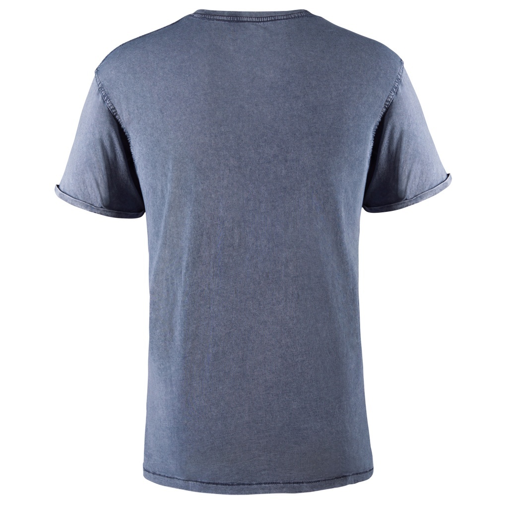T-shirt z krótkim rękawem o dżinsowym wykończeniu. Okrągły, prążkowany dekolt, wzmocniony szew na ramieniu, podwójne szwy w pachach oraz wywijane mankiety.