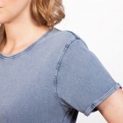 T-shirt z krótkim rękawem, dżinsowy efekt. Okrągły prążkowany dekolt ze wzmocnionym szwem na ramieniu. Podwójne szwy w pachach. Wywijane mankiety.