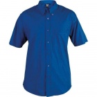 Męska koszula z krótkim rękawem uszyta z popeliny. Posiada klasyczny, krochmalony kołnierzyk z guziczkiem oraz kieszeń na lewej piersi. Zapięcie na siedem guzików w kolorze tkaniny. Wyprofilowany dolny brzeg zapewnia estetyczny wygląd i komfort noszenia. Prosta w użytkowaniu i pielęgnacji.