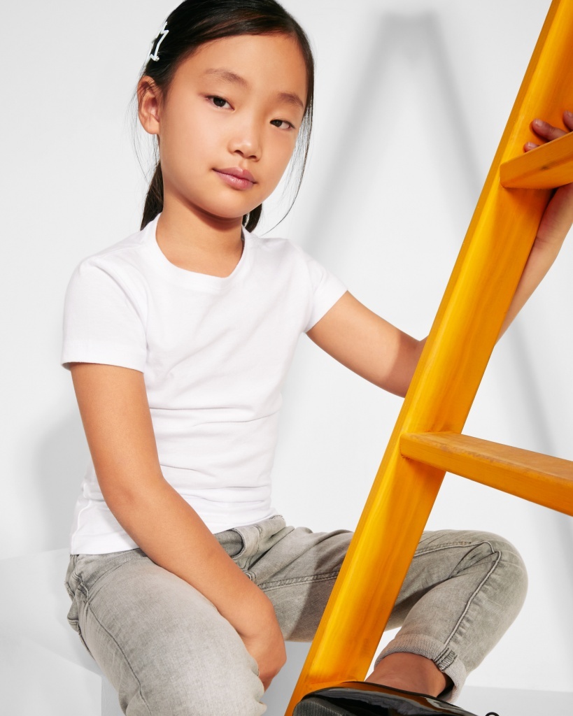 Dopasowana koszulka damska. Zaokrąglony, dwuwarstwowy ściągacz przy szyi, typowo damski fason. Wzmocnione, kryte szwy przy kołnierzyku i na ramionach, szwy boczne.