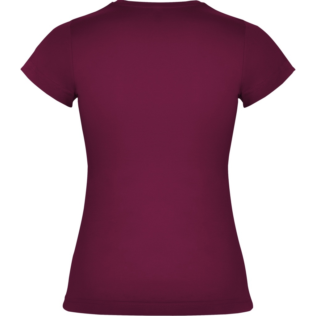 Dopasowana koszulka damska. Zaokrąglony, dwuwarstwowy ściągacz przy szyi, typowo damski fason. Wzmocnione, kryte szwy przy kołnierzyku i na ramionach, szwy boczne.