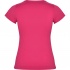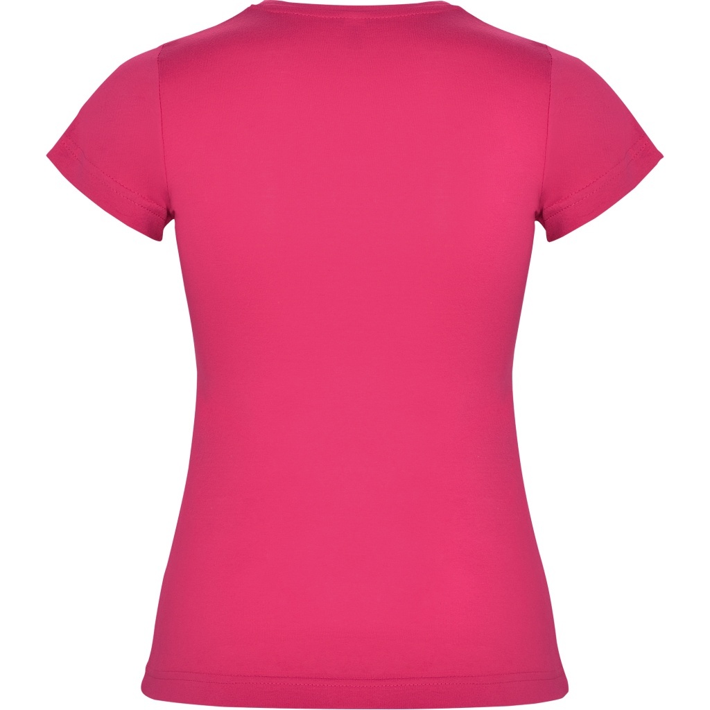 Dopasowana koszulka damska. Zaokrąglony, dwuwarstwowy ściągacz przy szyi, typowo damski fason. Wzmocnione, kryte szwy przy kołnierzyku i na ramionach, szwy boczne.