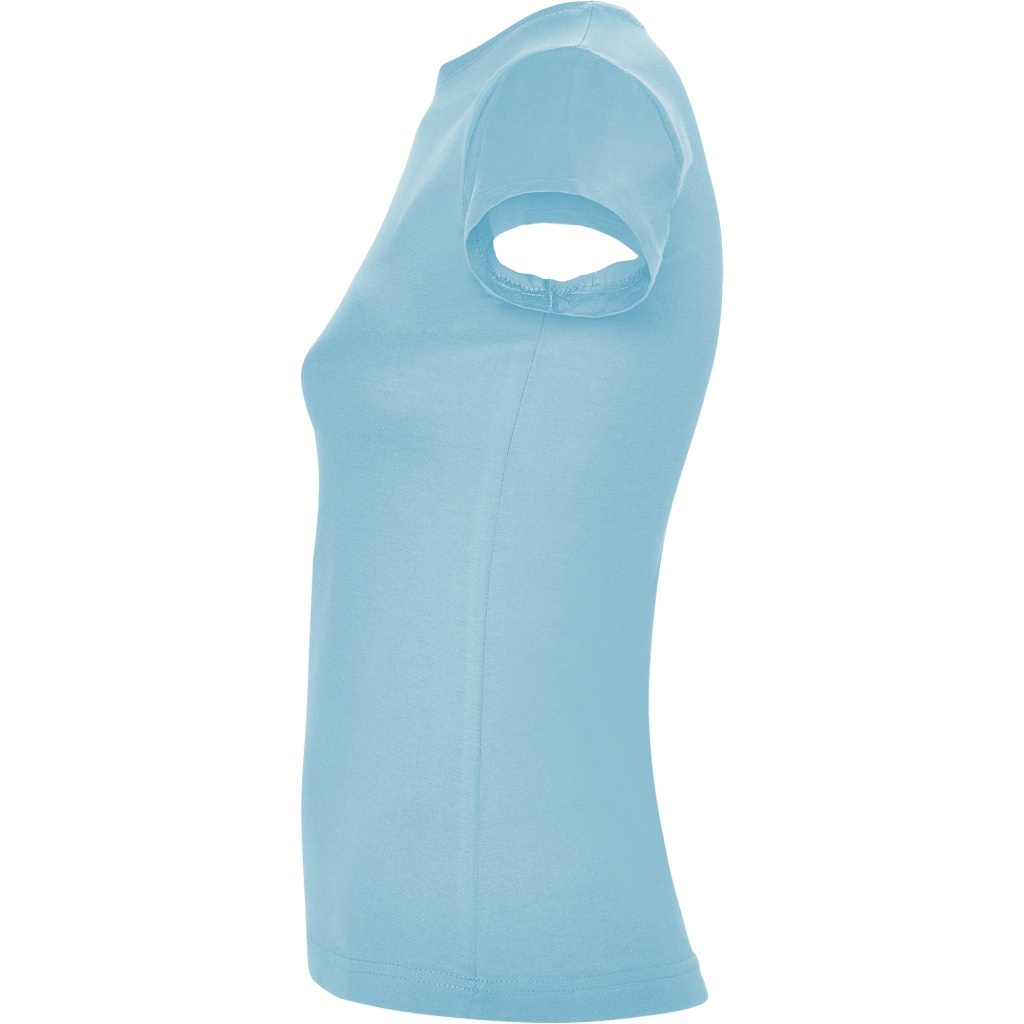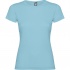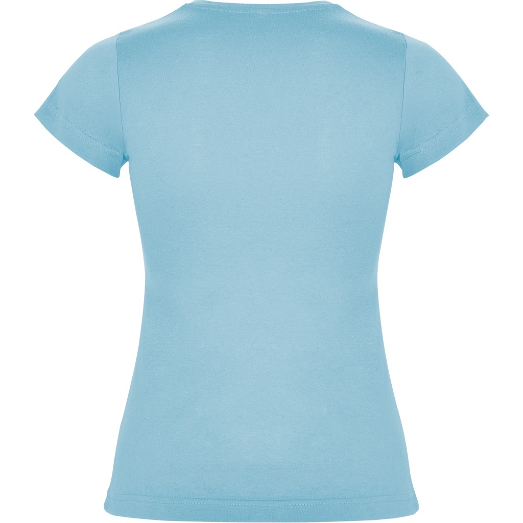 Dopasowana koszulka damska. Zaokrąglony, dwuwarstwowy ściągacz przy szyi, typowo damski fason. Wzmocnione, kryte szwy przy kołnierzyku i na ramionach, szwy boczne.
