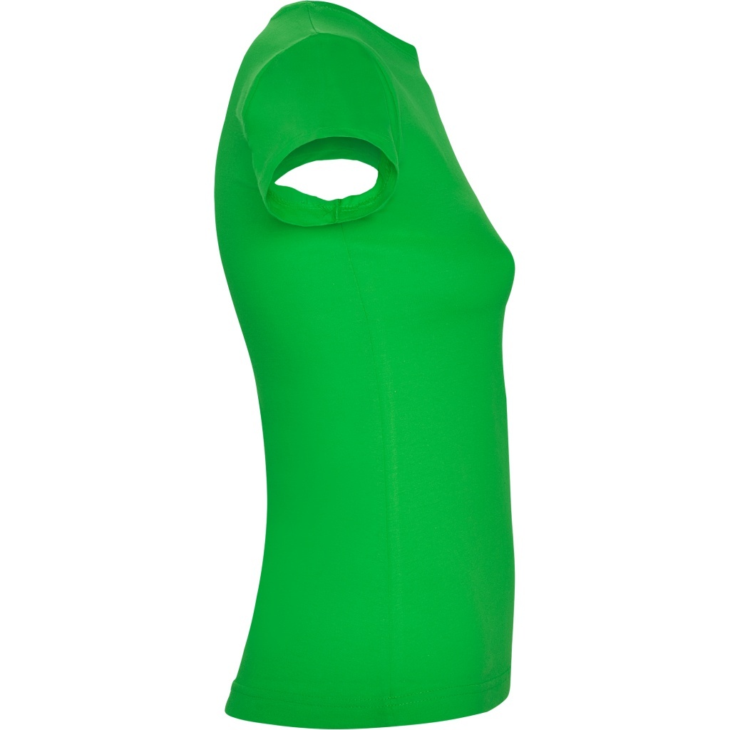 Dopasowana koszulka damska. Zaokrąglony, dwuwarstwowy ściągacz przy szyi, typowo damski fason. Wzmocnione, kryte szwy przy kołnierzyku i na ramionach, szwy boczne.